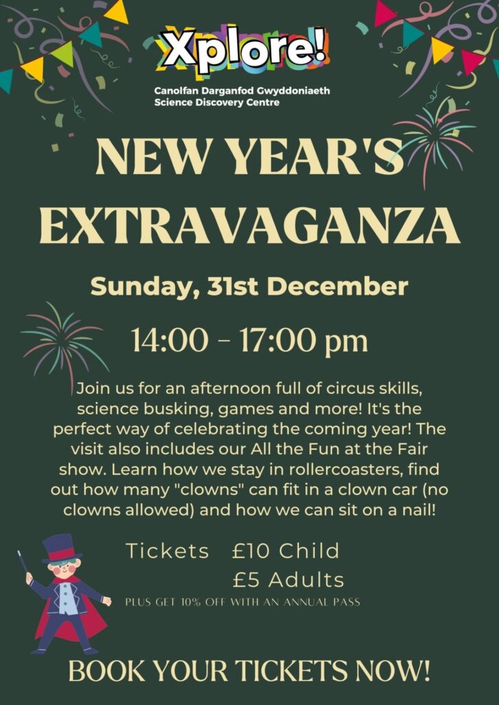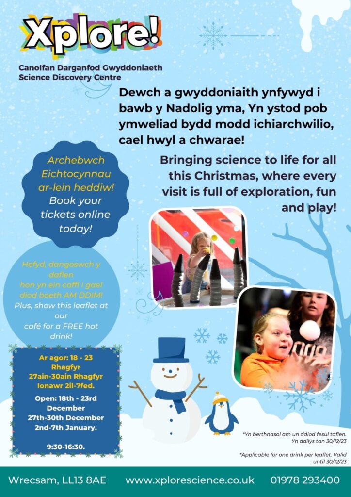 Xplore! is a local science discovery centre in Wrexham. Their indoor visitor attraction is open during the Xmas holidays (see website for exceptions). Children (and families) will enjoy playing with their interactive exhibits and joining their live science show ‘Winter Science’.